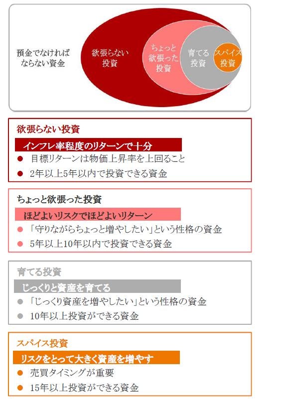 図表1は預金を含めた資産の全体設計の考え方のイメージを「お金のタマゴ」の形で表したものです。運用の目的や資金の性格、投資できる期間などを踏まえた上で、どの投資対象が自分に合っているかどうかを預金を含めた金融資産全体から考えることが大切です。
