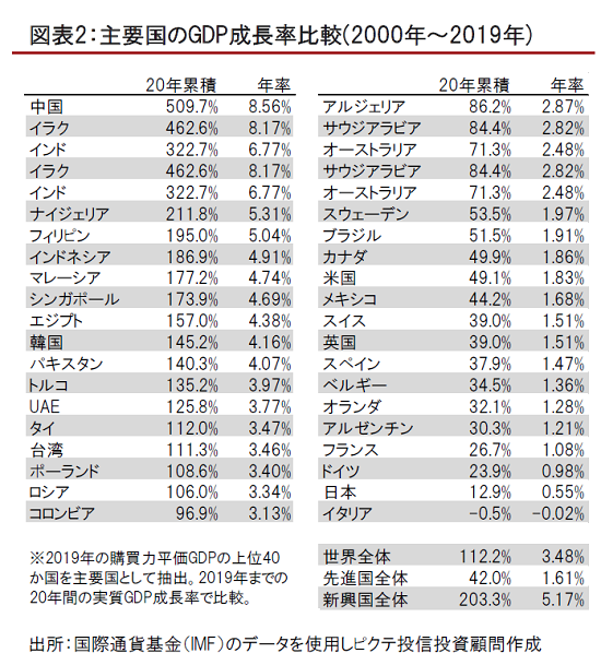 一方で、クラスの平均身長はどうでしょうか。このクラスの児童達の平均身長が、10年後に今と比べて大きく伸びているということは、かなりの確からしさで言えます。また、1人の児童を選んで平均身長の伸びを上回るというのはなかなか難しいのではないでしょうか。これが新興国市場全体に分散投資をするのと、1か国に集中投資する場合のアプローチの違いと考えるとイメージしやすくなるのではないでしょうか。国の成長も同じ様に考えることができます(図表2)。ただし、国の成長はマイナスの成長も起こり得ます。