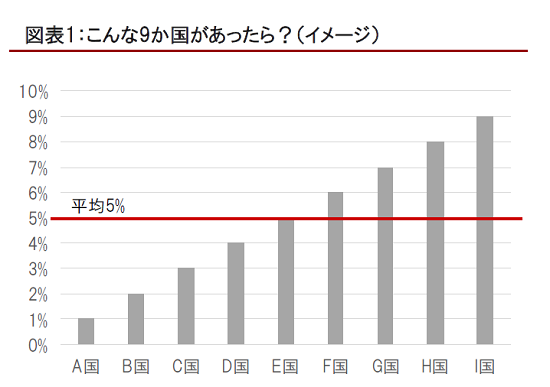 国の成長率=当該国の株式リターンとしてみると、例えばリターンが1%刻みで1%~9%の9か国に1/9ずつ分散して投資すると、全体のリターンは5%になります(図表1)。9%の国の高リターンも、1%の国の低リターンも平均化の中で薄まってしまうのです。もちろん、1か国だけを選んで投資した場合、10%の国を選んで高いリターンを得られる可能性もありますが、どの国のリターンが最も高くなるかを事前に知ることはできないため、1%のリターンとなってしまう可能性もあります。
