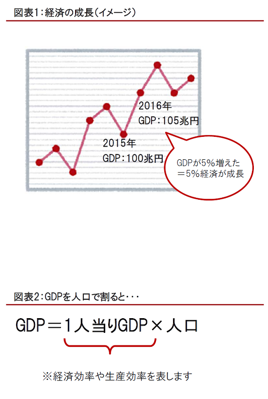 なお、GDPをその国の人口で割ると、1人当りGDPを計算できます。したがって、GDPは「1人当りGDP×人口」と表すことができます(図表2)。1人当りGDPは、1年間に国民1人当りいくらの付加価値を生み出したかを表します。これにより、経済がどのくらい効率的か、生産効率がどのくらい高いか、を示し、間接的には国民一人一人がどのくらい豊かか、といったことが分かります。