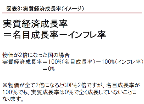 ただし、インフレによりあらゆるモノの値段が2倍になると、確かにGDPは2倍になりますが、稼いだお金で買えるモノの値段も同時に2倍になっています。そのため、本当に「経済が成長した」「国が豊かになった」とはいえません。「実質的にどれくらい豊かになったのか」を知るには単なる名目上のGDPの増加率だけを見るのではなく、そこから物価の上昇率を差し引くことで初めて、物価のかさ上げ効果を取り除いて実質的な経済成長を測ることができます。
