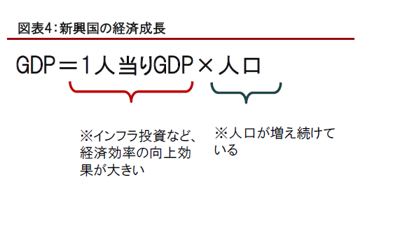 新興国の経済成長率が高いのは、人口が増え続けていることに加え、もともと1人当りGDPが低いためにインフラ投資などによる経済効率向上効果が非常に高く、更に人口増加 が経済効率向上にもプラス効果をもたらすことが理由として考えられます(図表4)。