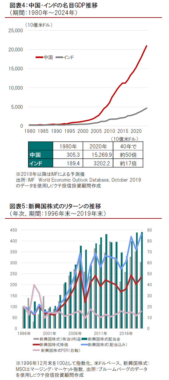新興国の経済成長の軌跡を振り返ると、新興国の大きな経済成長は短期的に達成されたものではなく、10年単位の時間をかけて達成されたものであることも確認できます(図表4)。国の大きな成長や発展は数ヶ月や数年で達成されるものではありません。