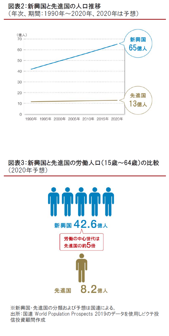 世界の人口は増加を続けていますが、その大部分を新興国が牽引しています(図表2)。新興国の豊富な労働人口は、付加価値を生み出す労働力としてだけでなく、消費の担い手としても経済成長の原動力になると考えられます(図表3)。