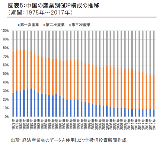 中国は、1970年代後半から1990年代にかけて市場の解放を徐々に進め、市場経済を取り入れてきました。それによって、農業や鉱業といった第一次産業の比率が下がり、製造業や建設業といった第二次産業が経済の牽引役となりました(図表4)。1990年代後半からは、第二次産業が頭打ちとなる中、金融や不動産といった第三次産業が台頭し、新たな経済の牽引役となります。また、近年ではテンセントやアリババといったIT企業が台頭し、IT産業が経済成長のドライバーの一つとなっています。