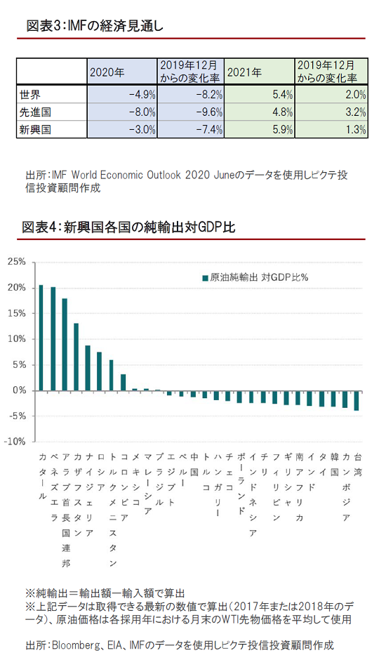 新型コロナウイルス感染症の感染拡大による需要の大幅な減少を伴う金融・経済への影響は、「原油需要減退による原油価格の下落で新興国経済に打撃」という表現から想起されるような、新興国だけがダメージを受けるわけではなく、先進国も同様であり、むしろ経済活動の落ち込む度合いは先進国のほうが高い予想となっていることが分かります。