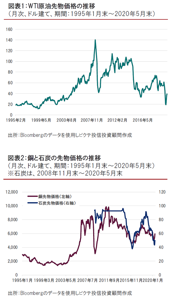 原油だけではなく、銅や石炭の価格も今回、同様の動きとなっています(図表2)。「産業の血管」とも呼ばれる銅は、産業インフラ構築に欠かせない金属資源ですが、新型コロナウイルス感染症の影響によりインフラ投資が滞るとの懸念から下落しました。石炭に関しては、火力発電の主な燃料であることから、経済活動の停滞により電力の使用量が減少することが予想され、下落しました。また、世界的な環境問題に対する意識の高まりから、石炭を使用する火力発電から再生可能エネルギーへの転換が進み、石炭の需要が減少しているという構造的な要因もあります。