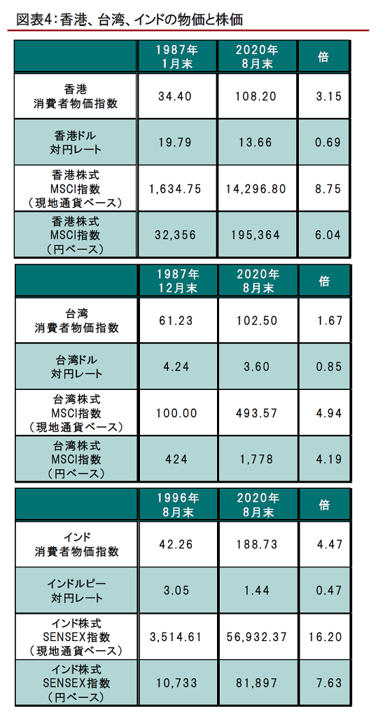 それでは、ブラジル同様に、香港、台湾、インドで検証していきましょう。図表4をご覧ください。まず、一番上の香港です。約34年の期間で、物価は3.15倍、通貨は対円レートで0.69倍となっています。一方、この期間の香港の株式は、物価上昇の3.15倍を上回る8.75倍に上昇しており、株式のリターンが物価上昇率を上回りました。インフレによる通貨価値の下落が心配ですが、株式は円ベースでみても6.04倍となっており、プラスになっていることが確認できました。