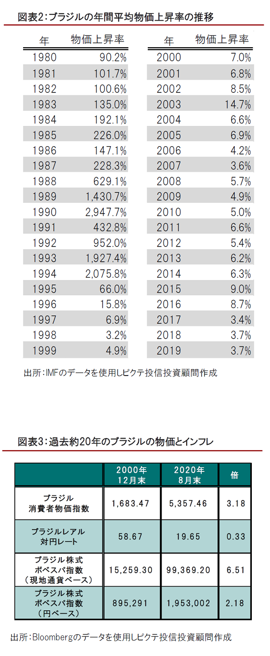 それでは、実際のブラジルの例で検証してみましょう。ブラジルも過去にハイパーインフレを経験し、90年代のインフレが特に酷く、年率2,000%を超える激しいインフレが発生し、90年代の10年間だけで物価は約167万倍になりました(図表2)。更に1997年に発生したアジア危機、1998年に発生したロシア危機の影響も大きく受け、IMFなどの支援を受けながら、金融経済を何とか立て直せたのは2000年代に入ってからのことでした。