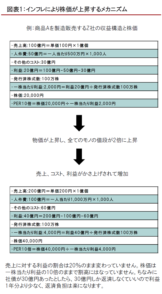 では、物価上昇は企業の収益と株価の面から見るとどうなるでしょうか(図表1)。例えば、物価全体が上昇し、全てのものの値段が2倍に上昇したとします。このとき、単価100円の商品Aを製造・販売するZ社の売上は、単価が2倍の200円になったことで売上個数が増えなくても売上高は2倍になりました。一方で、人件費も2倍になり、その他のコストも2倍になりますが、利益率が変わらなくても、利益額は2倍になります。