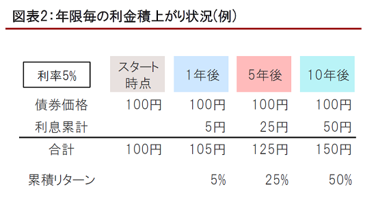 債券投資から得られるリターンは、インカムゲインとキャピタ ルゲインということを説明しましたが、償還まで保有していれ ば、当該発行体にデフォルトが生じないかぎり、保有期間中 の利金が得られ、償還時には額面が戻ってきます。債券投 資は時間をかけて利金を積上げる投資で、図表2の例を用 いて保有(償還)年限毎の利金の積上がり状況を確認してみ ます。ここでは、利率5%で1年後、5年後、10年後を比較し てみましょう。わかりやすくするために、債券価格は変動せ ず、コストもかからないものとして計算します。