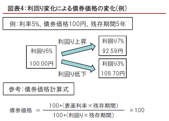 残存期間5年の利回り5%、債券価格100円の債券が、利回 り7%まで上昇して買い手と売買が成立する場合と、利回り 3%で売買が成立する場合を例として見てみます。利率5% の債券を7%の利回りで購入するためには価格を100円以下 にしなくてはなりません。価格の計算式は図表4の通りです。 また、3%の利回りにする場合には100円よりも高い価格で購 入することになります。このように、利回りが上昇すれば価格 が下がり、利回りが低下すれば価格が上がる、という関係に あります。