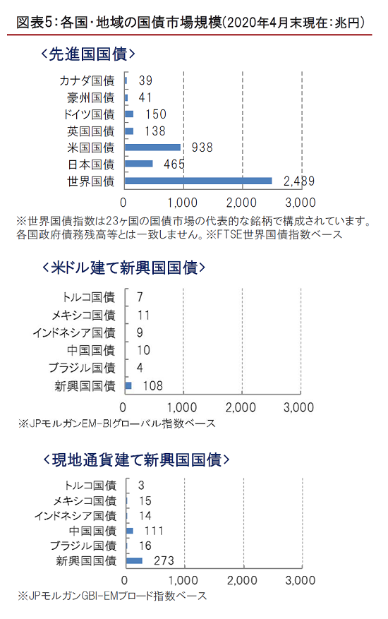 新興国国債は先進国国債に比較して相対的に利回り面では 魅力的ですが、市場規模は先進国国債と比較すると小さい ことに注意する必要があります(図表5)。