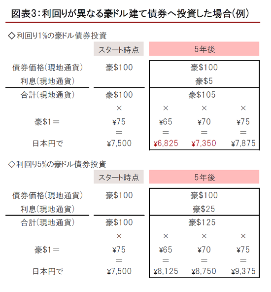 日本の現状の金利水準では1%の金利でも高いと思います が、図表3の例で、利回り1%と5%の豪ドル建ての債券に投 資する場合を考えてみましょう。期間5年で債券価格は変 動せず、コストもかからないものとして計算します。 利回りが1%の場合、利金収入が5年間積上がったとしても 豪$5にしかならず、スタート時点よりも5円の円高豪ドル安に なっただけでも、スタート時点よりもマイナスになってしまいま す。一方、利回りが5%ですと、5年間の利金収入の積上がり が豪$25となり、スタート時点よりも10円の円高豪ドル安と なってもプラスとなります。