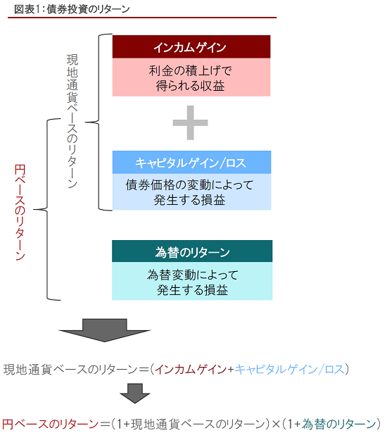 債券に投資した後、景気動向、物価動向、債券に対する需 給関係等により債券利回りは変化します。債券は、発行日、 額面、利率、償還日が決められていることから、債券利回りは 債券価格の変動によって上下し、債券価格の値下がり時に売 却することで発生する損失をキャピタルロスと言い、債券価格 の上昇によって得られるリターンをキャピタルゲインと呼びます。 このように債券投資から得られるリターンはインカムゲインと キャピタルゲインですが、海外の債券に投資する場合は為替 レートが変動することで得られるリターンが加わります(図表1)。 もちろん、為替が逆方向に動いた場合にはマイナスのリターン となりますので注意が必要です。