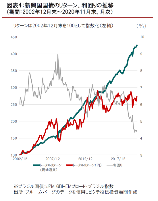 2002年12月末から約18年間のリターンを見ると現地通貨ベース(緑)で325.7%の上昇でした。円ベース(赤)のリターンは173.8%でした。債券利回り(灰色)が低下していることで、現地通貨ベース、円ベースともプラスのリターンとなっていますが、リターンの差は為替の影響が大きかったことがわかります。新興国への投資では、経済成長を反映した通貨の上昇も期待できますが、この期間では残念ながらマイナスになりました。