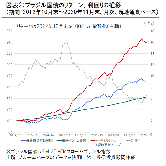 それではブラジル国債を例に実際のリターンを見てみましょう(図表2)。指数データが遡れる2012年10月末から投資を行ったとします。