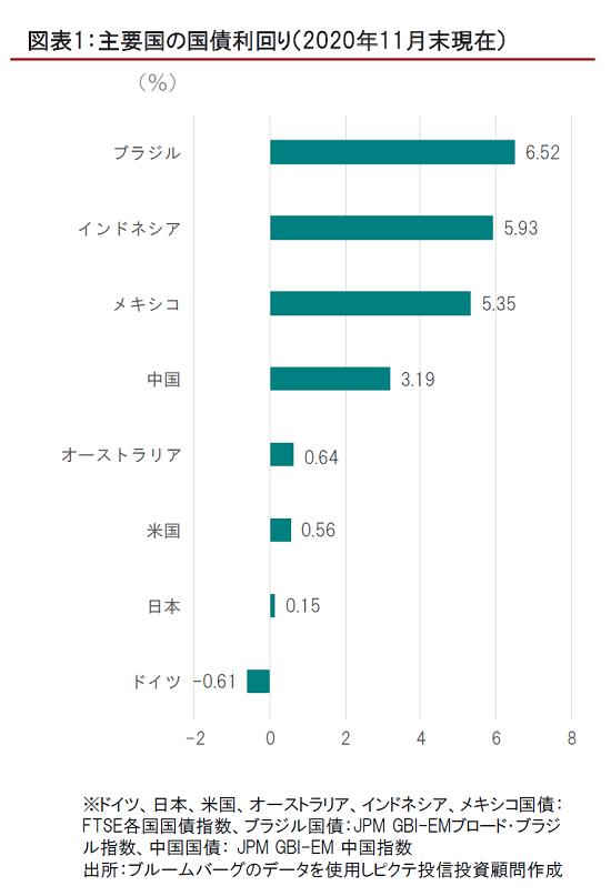 債券投資から得られるリターンはインカムゲインとキャピタルゲインですが、新興国を含めた海外の債券に投資する場合は為替レートが変動することで得られるリターンが加わります。もちろん、為替が逆方向に動いた場合にはマイナスのリターンとなりますので注意が必要です。日本は低金利が続いていますが、海外には新興国を中心に相対的に金利が高い国がまだあります(図表1)。