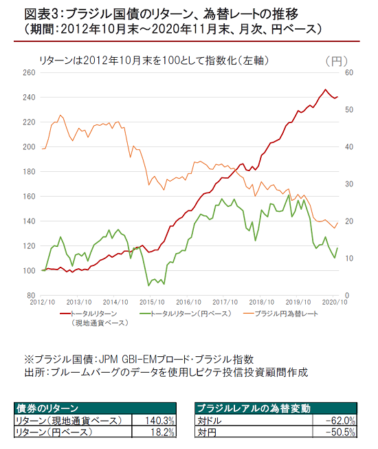 次に円ベースでのリターンを確認します(図表3)。円ベースでの投資リターンは18.2%と、現地通貨ベースのリターンに比べ大きく低下しました。この期間、ブラジルレアルの対円レート(橙色)は50.5%も下落しており、為替要因はマイナスに寄与したことが分かります。