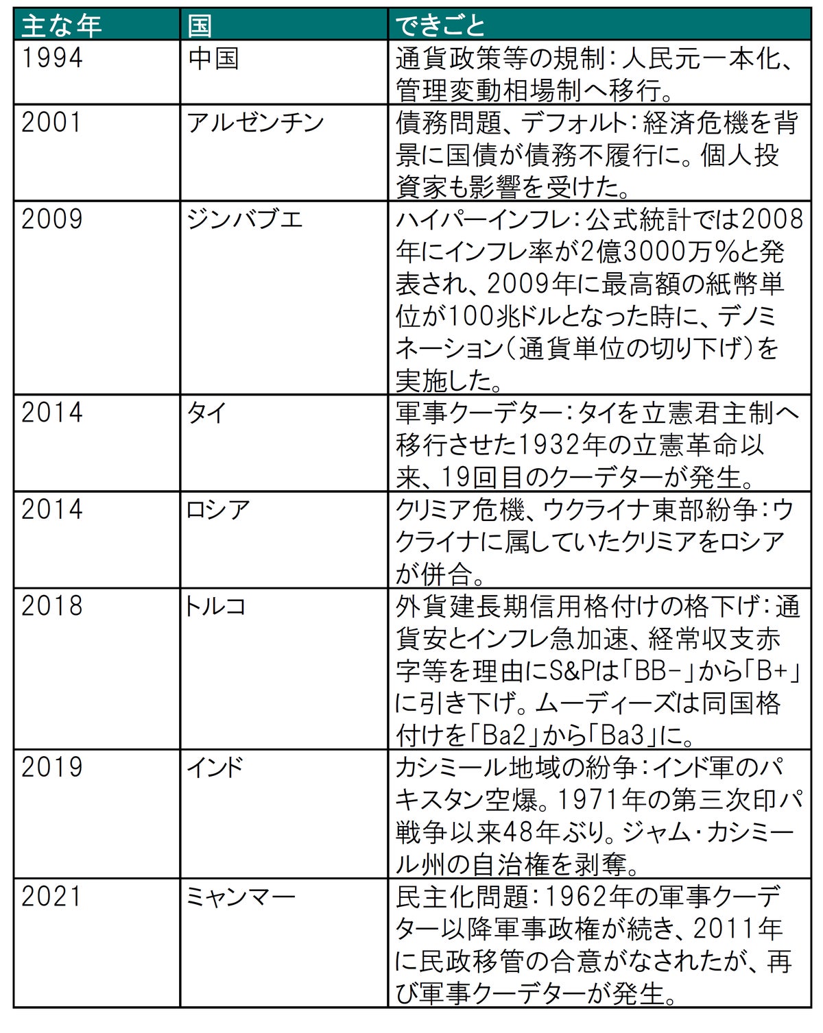 まず新興国投資で特有のリスクとして、カントリー・リスクが挙げられます。新興国は、一般に政治・経済・社会情勢の変動が先進国と比較して大きくなる場合があり、政治不安、経済不況、社会不安が証券市場や為替市場に大きな影響を与えることがあります(図表1)。