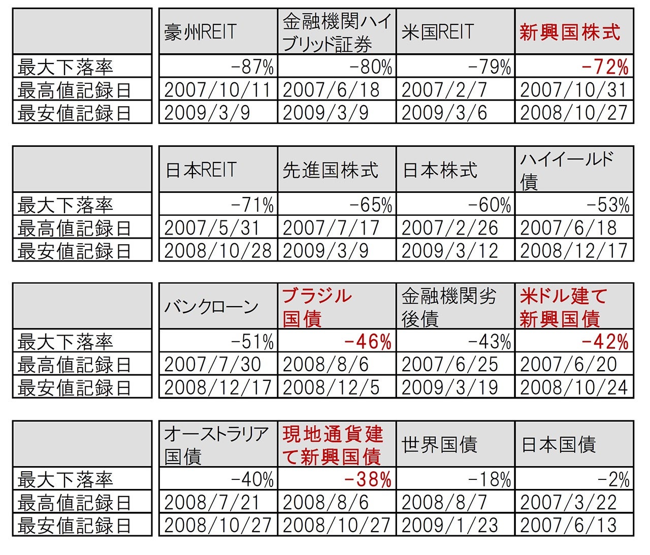 こうした新興国株式のような高リスク資産に投資する場合、投資するタイミングによって良い時と悪い時の差が非常に大きくなります。またリーマンショック時などの金融危機の際には大きく下落してしまうことも考えられます(図表3)。