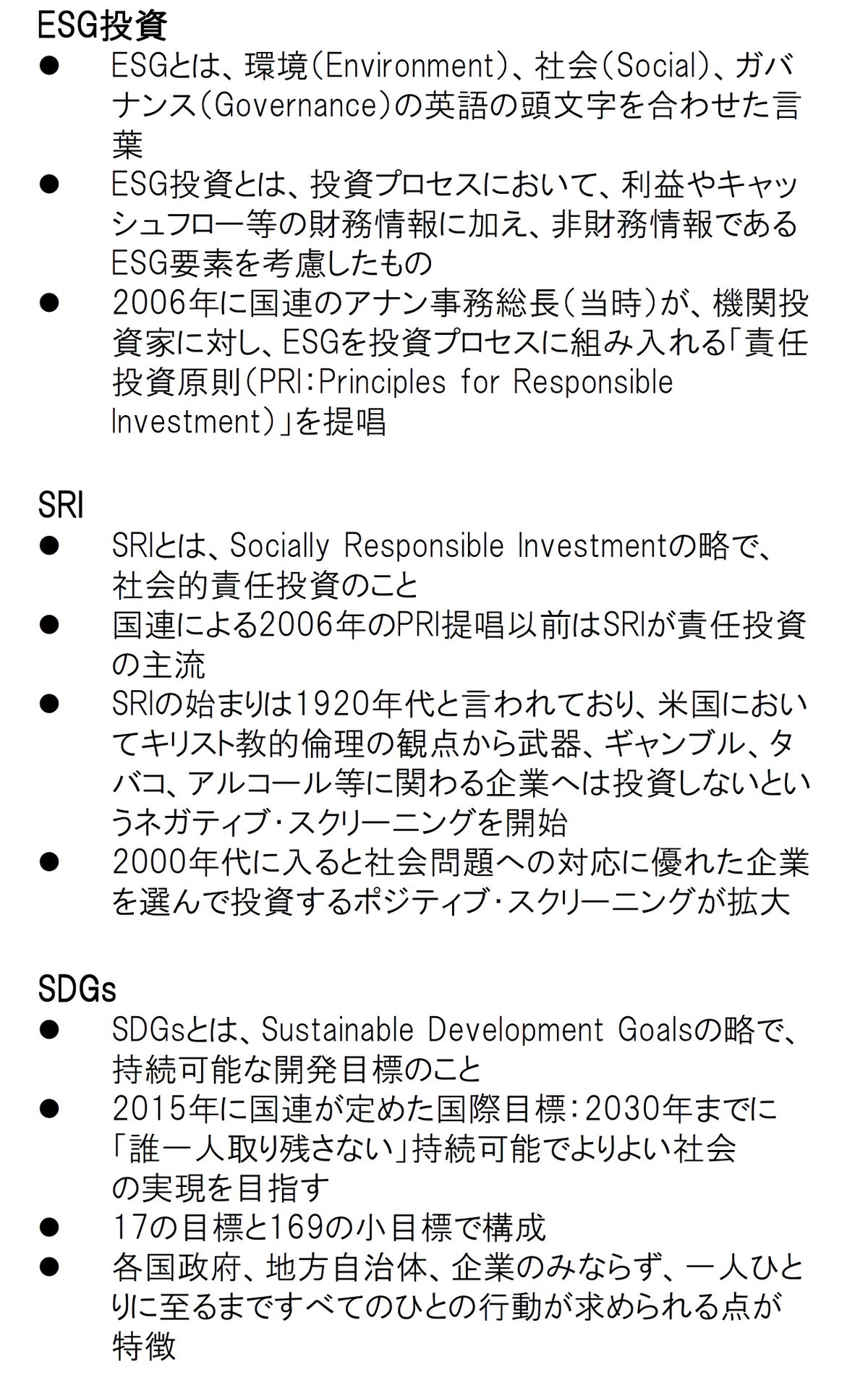 図表1:ESG投資、SRI、SDGsそれぞれのポイント