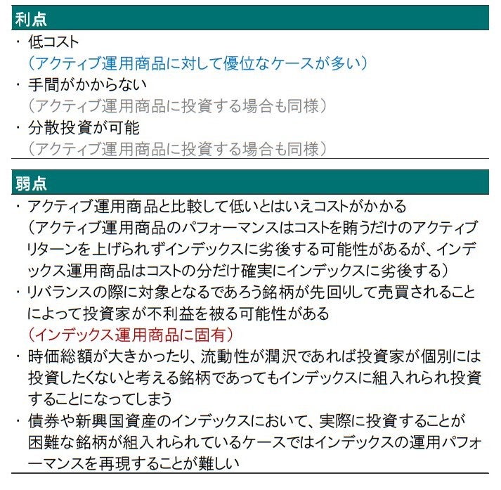 投資家がインデックス運用商品に投資することによる利点(図表2)としては、①アクティブ運用商品と比較して一般にコストが低いこと、②銘柄選択などの手間がかからないこと、③分散投資が可能なこと、などが挙げられます。しかし、②と③に関してはアクティブ運用商品に投資した場合も同様です。①のコストに関しては、確かにアクティブ運用商品に対してインデックス運用商品の方が優位なケースが多いものの、そのコストの対価として得られるリターンを事前に正しく予見することはできません。過去にはインデックス運用商品のリターンがアクティブ運用商品のリターンに勝るケースが多かったことが事実だとしても、それが今後もインデックス運用商品のリターンがアクティブ運用商品のリターンに勝ち続ける保証になるわけではない点には留意が必要でしょう。