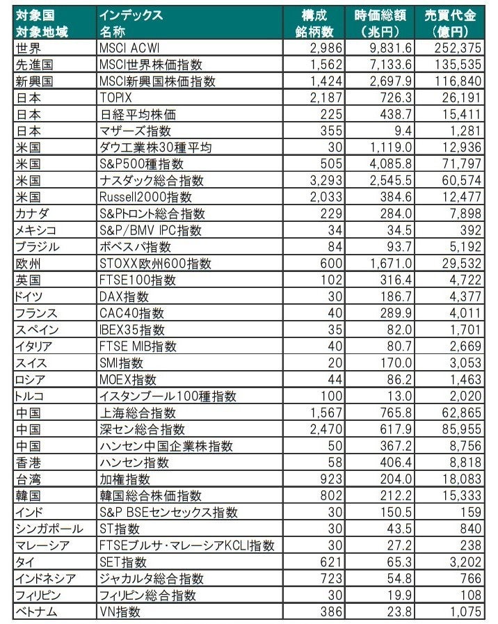 インデックスの算出方法にはいくつかありますが、「時価総額加重平均型」(時価総額が大きい銘柄のインデックスへの影響度が大きい)が主流です。一般によく知られる日経平均株価やダウ工業株30種平均は「株価平均型」(株価水準の高い「値がさ株」のインデックスへの影響度が大きい)を採用しています。