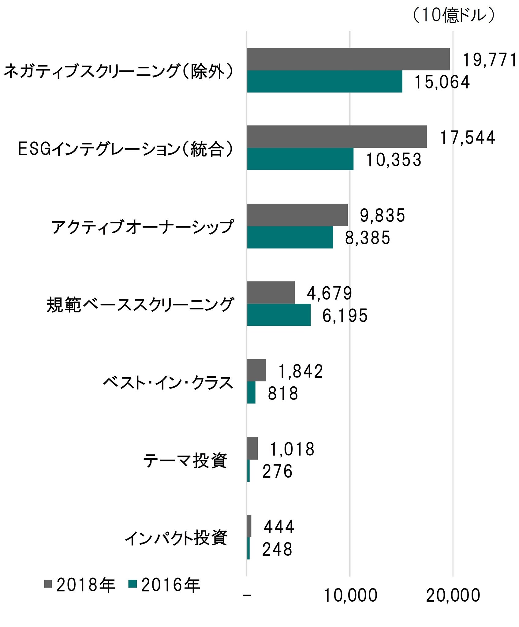 GSIA(Global Sustainable Investment Alliance)によると、ESG投資戦略は、①ネガティブスクリーニング(除外)、②規範ベーススクリーニング、③ベスト・イン・クラス、④ESGインテグレーション(統合)、⑤テーマ投資、⑥インパクト投資、⑦アクティブオーナーシップ{エンゲージメント(対話)及び議決権の行使}に分類されます。2016年から2018年にかけて、ほぼ全ての戦略において残高が拡大しており、この傾向は今後も続くと考えられています。
