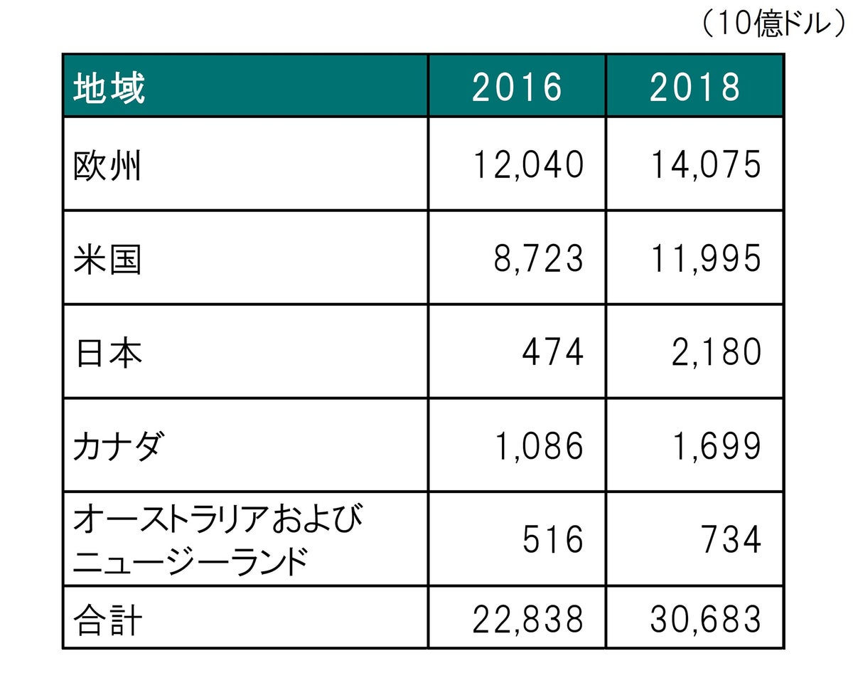 主要国・地域のESG投資の運用残高は2016年の22.8兆ドルから2018年には30.7兆ドルに急増しました(図表2)。地域別の運用残高では欧州が半分近くを占めています。