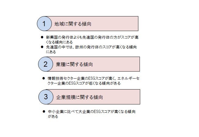 一般的にESGスコアは、算出の際の評価対象となるESG情報の開示が標準化されていないことなどから、地域、業種、企業規模に一定の傾向が見られます。例えば、国別のESGスコアの集計を見ると、新興国の発行体よりも先進国の発行体の方が相対的に高いESGスコアが付与される傾向が見られます。また、先進国の中でも責任投資の考え方が早期から取り入れられ、ESG投資に関する法制度が整備されてきた欧州の発行体の方がスコアが高い傾向にあります。業種別では、情報技術セクター企業のESGスコアが高くなる一方で、企業活動における温室効果ガスの排出量が多いことなどから、エネルギーセクター企業のESGスコアが低くなってしまう傾向があります。企業規模別で見ると、中小企業よりも大企業の方がESGスコアが高くなりやすい傾向があります(図表1)。