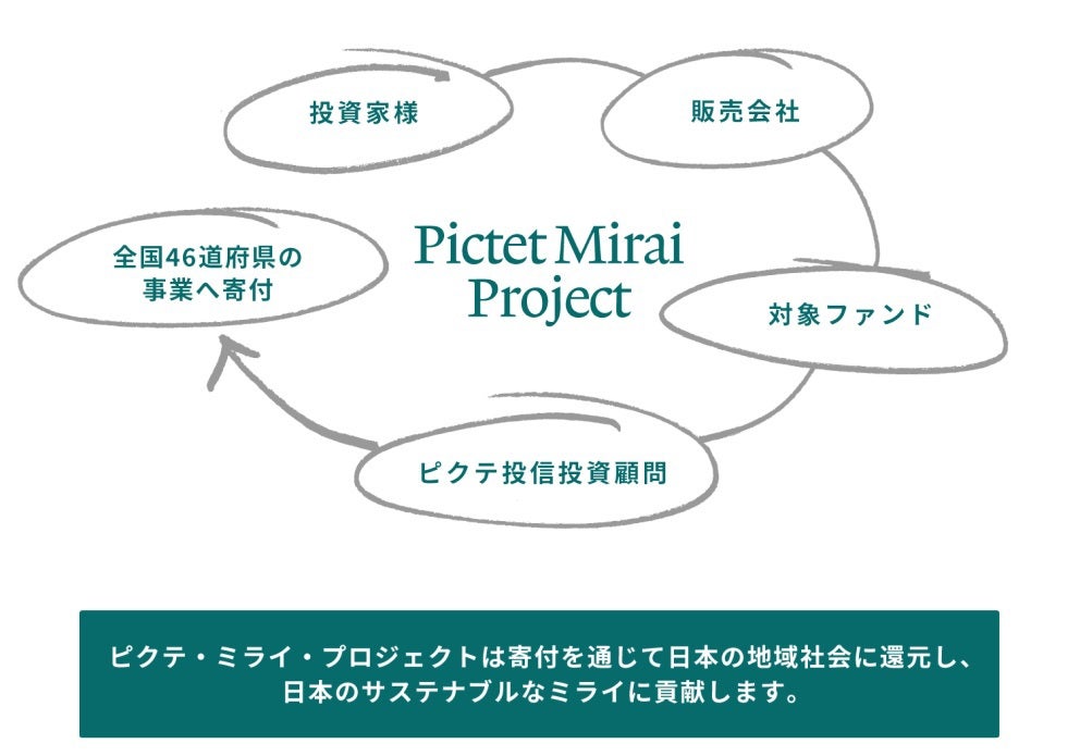 ピクテ・グループは、「顧客・同僚・地域社会・投資先企業と責任あるパートナーシップを構築し、あらゆる富を守り、次世代に継承していくことで、実体経済に貢献すること」をミッションの一つに掲げています。ピクテ・グループの近年の活動としては、①国連責任投資原則(PRI)に署名、②国連責任銀行原則(PRB)に署名、③スイス・サステナブル・ファイナンス(SSF)に加盟、④国際エネルギー機関(IEA)と協業、⑤スイス気候基金の設立などがあげられます。また、環境への取組みにも力を入れており、カーボン・ニュートラルを実現しています。日本においては、「ピクテ・ミライ・プロジェクト」を開始し、当社が受け取っている収益(信託報酬)の一部を、46道府県の地域再生計画に基づく事業へ寄付する予定です。