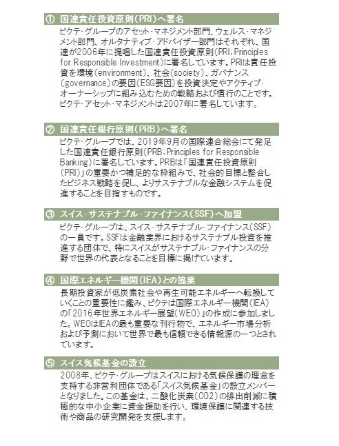 ピクテ・グループは、「顧客・同僚・地域社会・投資先企業と責任あるパートナーシップを構築し、あらゆる富を守り、次世代に継承していくことで、実体経済に貢献すること」をミッションの一つに掲げています。これは、ピクテ家が古くから続けてきた慈善活動を基礎としています。エピソードの一つに、古くは18世紀、アメデ=ピエール=ジュール=ピクテ・ド・セルジが、1307年のスイス連邦共和国建国の誓いの場所であるウリ湖付近の「リュートリの丘」がホテル開発の危機にさらされていることを知り、一般公募で資金を集め、その土地を守ったというものがあります。こうした精神は、ピクテの企業文化の基盤として連綿と受け継がれ、環境や次世代の利益を考えて行動するというサステナブル投資への取組みに繋がっています。また近年の活動としては、①国連責任投資原則(PRI)へ署名、②国連責任銀行原則(PRB)へ署名、③スイス・サステナブル・ファイナンス(SSF)へ加盟、④国際エネルギー機関(IEA)との協業、⑤スイス気候基金の設立などがあげられます(図表1)。