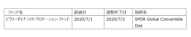 さて、弊社が設定・運用しております下記ファンドは、その組入投資信託証券をルックスルーして得られた有価証券等のエクスポージャーの額が、一般社団法人投資信託協会の定める「投資信託等の運用に関する規則」第17条の2で規定する、信用リスク集中回避のための投資制限を超過したため、同条の規定にしたがって基準比率以内となるよう調整を行い、それを完了いたしました。同協会の定める「投資信託及び投資法人に係る運用報告書等に関する規則」第19条の2の規定に基づき、ここにお知らせいたします。