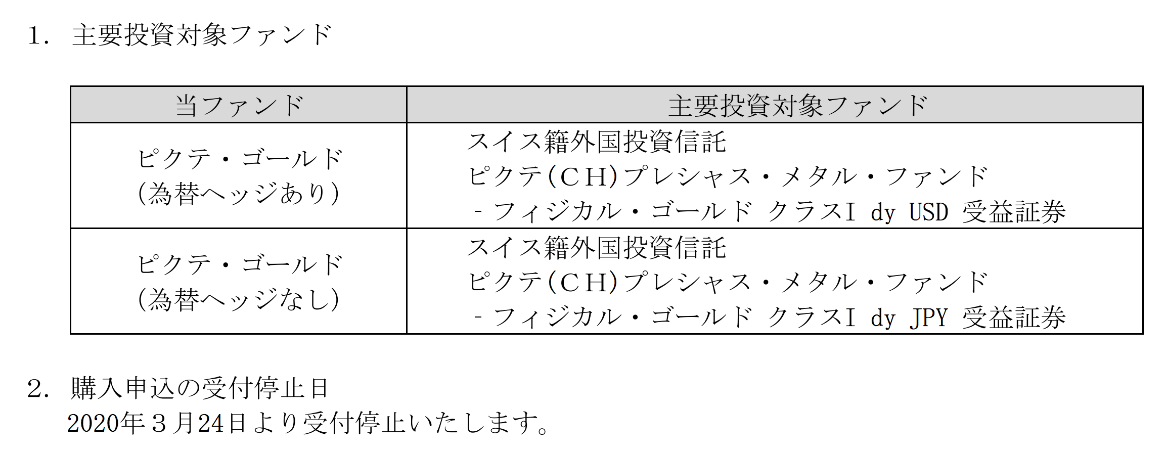 さて、ご愛顧いただいております「ピクテ・ゴールド(為替ヘッジあり)」および「ピクテ・ゴールド(為替ヘッジなし)」(以下「当ファンド」といいます。)につきまして、当ファンドの主要投資対象であります外国籍投資信託(以下、「主要投資対象ファンド」といいます。)の購入受付を一時停止する予定です。