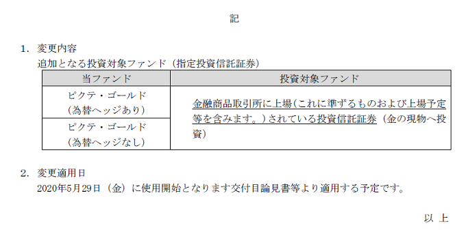 - 「ピクテ・ゴールド(為替ヘッジあり)」「ピクテ・ゴールド(為替ヘッジなし)」投資対象ファンド(指定投資信託証券)の追加に係るお知らせ