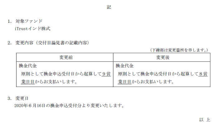 さて、ご愛顧いただいております「iTrust インド株式」(以下「当ファンド」といいます。)につきましては、換金時の換金代金のお支払日を、本年6月16 日の換金申込受付分より下記のとおり短縮することとなりましたのでご案内申し上げます。