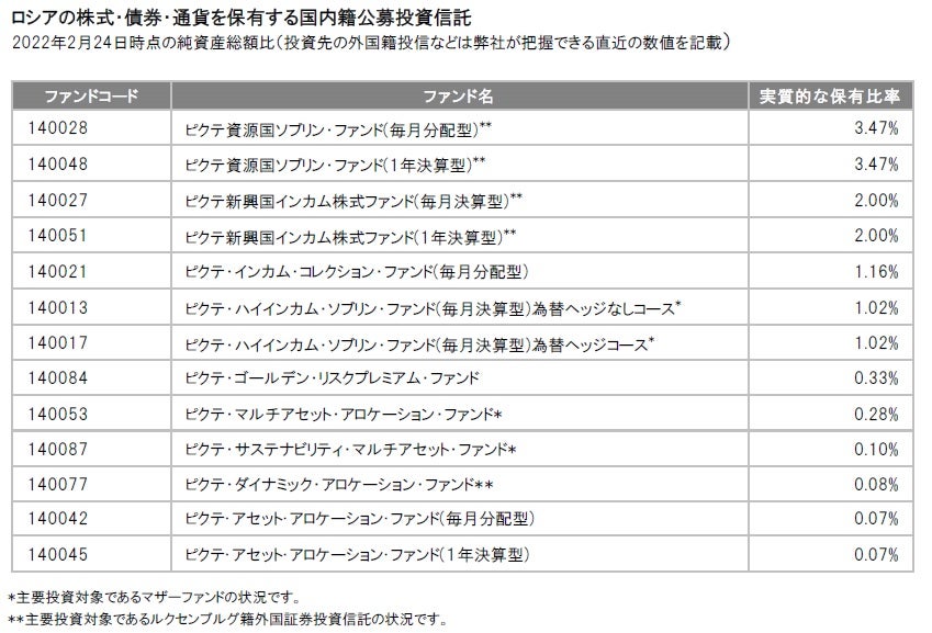 弊社の国内籍公募投資信託(2022年2月24日時点)における、ロシアまたはウクライナの株式・債券・通貨を保有しているファンドと実質的な保有比率(純資産総額比)を以下の通りご報告いたします。