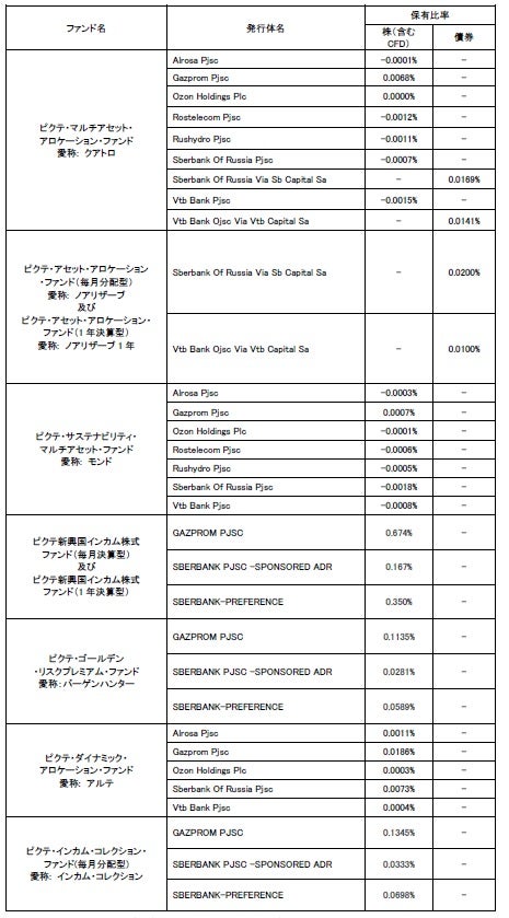 平素は格別のご愛顧を賜り、厚く御礼申し上げます。弊社が設定・運用しております公募投資信託及び公募投資信託が投資する投資信託における、米国財務省外国資産管理室(OFAC:Office of Foreign Assets Control)のロシア制裁銘柄の有価証券保有状況について、下記の通りご報告申し上げます。