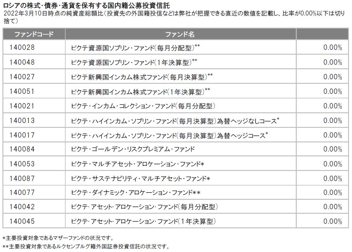 弊社の国内籍公募投資信託の主要投資対象であるルクセンブルグ籍投資信託及びマザーファンドが保有するロシア関連の株式・債券・通貨を2月末以降順次売却、もしくは評価価格をゼロと致しました。つきましては2022年3月10日現在の保有比率(純資産総額比)は下記の通りとなっております。