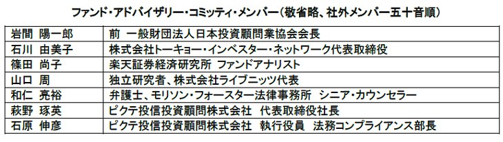 「ファンド・アドバイザリー・コミッティー」では、メンバーに社外の有識者を招致し、積極的に意見を取り入れています。その拡充にあたり、2019年10月に運用業界および金融・経済市場に精通した石川由美子氏、2020年8月にマーケティング戦略の策定や組織開発等に精通した2名をメンバーに迎え、合計7名体制となりましたことをお知らせいたします。