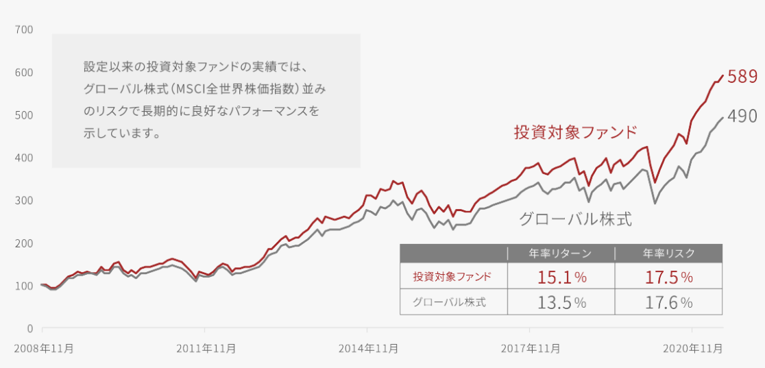 ※上記は、シェアクラスが異なる投資対象ファンドの運用実績(円換算)であり、当ファンドの運用実績ではありません。投資対象ファンドの運用実績をイメージいただく目的で、当ファンドが投資するクラスZ JPY投資証券と同じ運用を行うクラスI USD投資証券の運用実績やその他情報を示しています。当ファンドの投資対象とは費用および通貨が異なりますのでご留意ください。