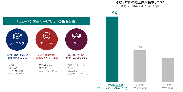 当ファンドは、人々の充実した人生を支える「ラーニング」「エンジョイ」「ケア」の3つの投資分野に着目します。これらの分野に関連したサービスを提供するヒューマン関連企業の今後3年間の売上高成長率は、世界IT株式や世界株式指数の組み入れ企業の成長率を上回ることが予想されています。