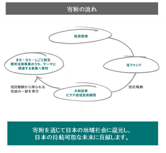 大和証券と弊社は、当ファンドの信託報酬から得られる収益の一部を寄附します。主な寄附先のテーマには、「教育」「福祉」「防災・復興」などが含まれます。寄附は、主に内閣府が認定する地域再生計画に基づいて行われる、SDGs関連の「まち・ひと・しごと創生寄附活用事業」に対して年1回実施し、日本の地域社会への還元を目指します。