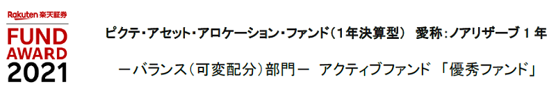 弊社が運用する「ピクテ・アセット・アロケーション・ファンド(1年決算型) 愛称:ノアリザーブ1年」が、楽天証券株式会社(本社:東京都港区、代表取締役社長:楠 雄治)が開催する第7回「楽天証券ファンドアワード」 において「優秀ファンド」に選出されたことをお知らせします。