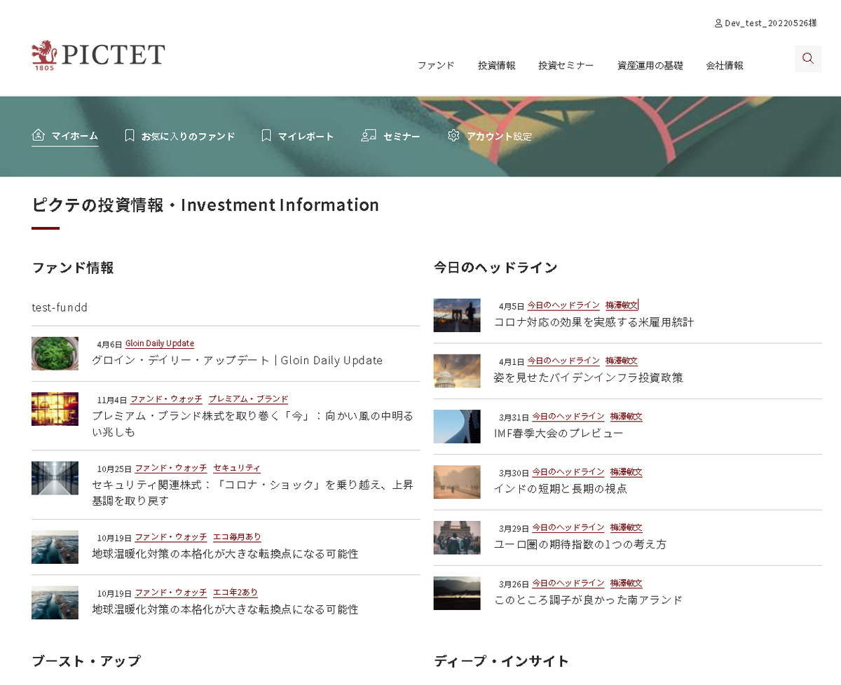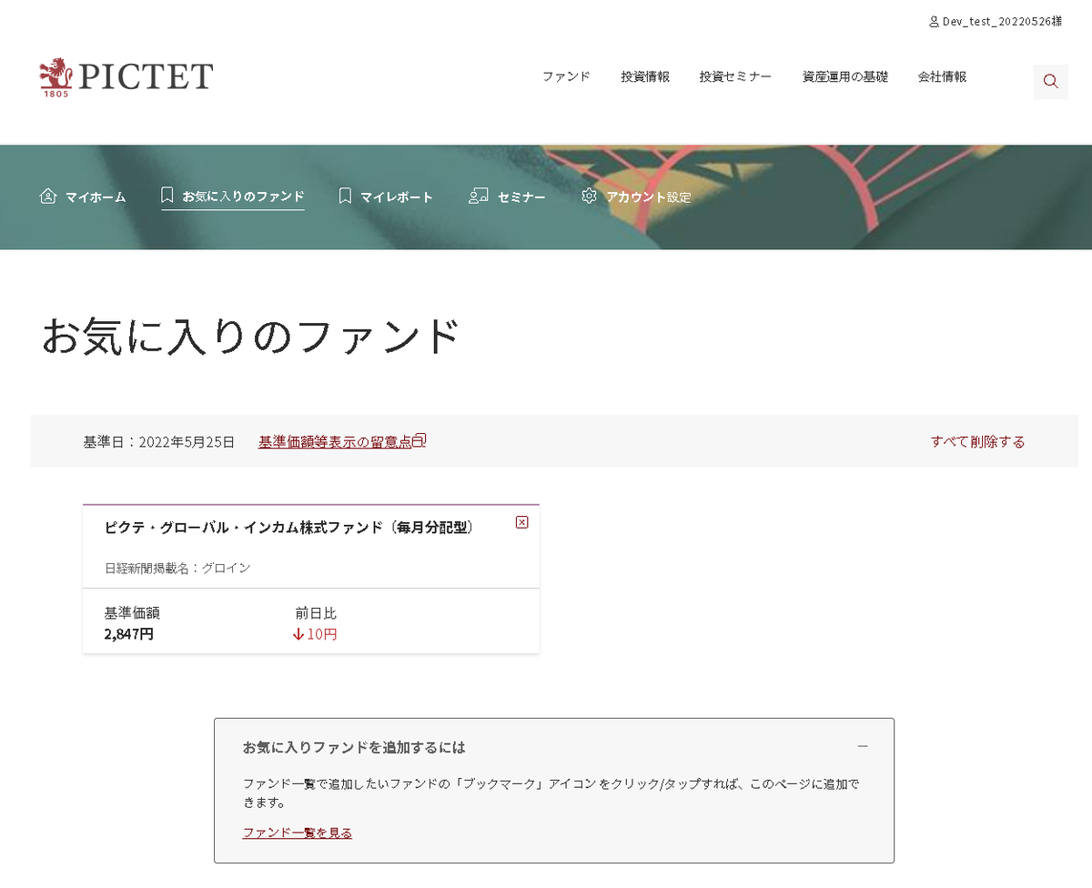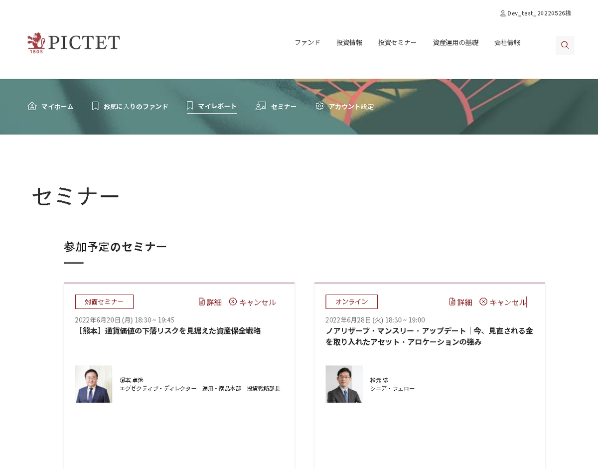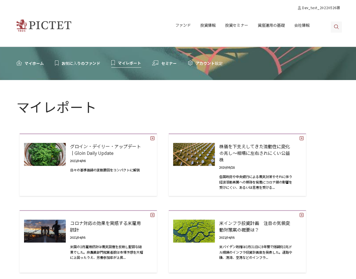 会員ページでは、ピクテの最新の投資情報を一覧でご確認いただける他、お気に入りのファンドやレポートのご登録、お申込みいただいたセミナーの管理などが行えます。