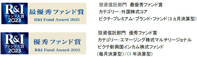 - 弊社が運用する「ピクテ・プレミアム・ブランド・ファンド(3ヵ月決算型)」が “R&I ファンド大賞 2023”において最優秀ファンド賞を受賞、「ピクテ新興国インカム株式ファンド(毎月決算型)/(1年決算型)」が優秀ファンド賞を受賞