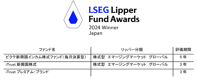 弊社が運用する「ピクテ新興国インカム株式ファンド(毎月決算型)」、「iTrust新興国株式」、「iTrustプレミアム・ブランド」の3ファンドが、LSEGリッパー・ファンド・アワード・ジャパン 2024において最優秀ファンド賞を受賞したことをお知らせします。