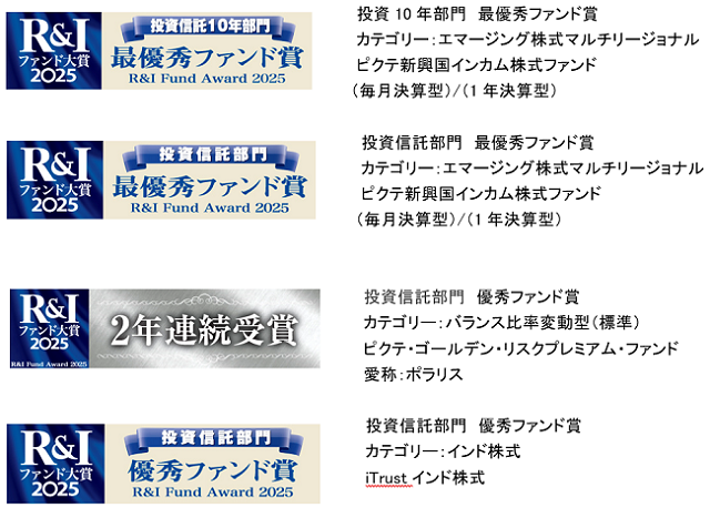 - 「ピクテ新興国インカム株式ファンド(毎月決算型)/(1年決算型)」、 「ピクテ・ゴールデン・リスクプレミアム・ファンド」、「iTrustインド株式」の 3ファンドがR&Iファンド大賞 2025受賞