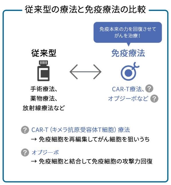 従来型のがんの治療法としては、手術療法、薬物療法(抗がん剤)、放射線治療が3大療法とされ、広く認知されています。一方で、3大療法に代表される従来型の治療法は、体の健康な部位や細胞に負担をかけることによる副作用や、がんの進行状況などによっては治療が難しい場合があることなどが課題でした。そこで、新しいがんの治療法として注目を集めているのが、がんの免疫療法です。免疫療法は、ヒトの免疫機能を高めてがんを治そうとする治療法で、従来型の治療法ではで治療しきれたかったがんに対する新たな治療の選択肢となることが期待されています。